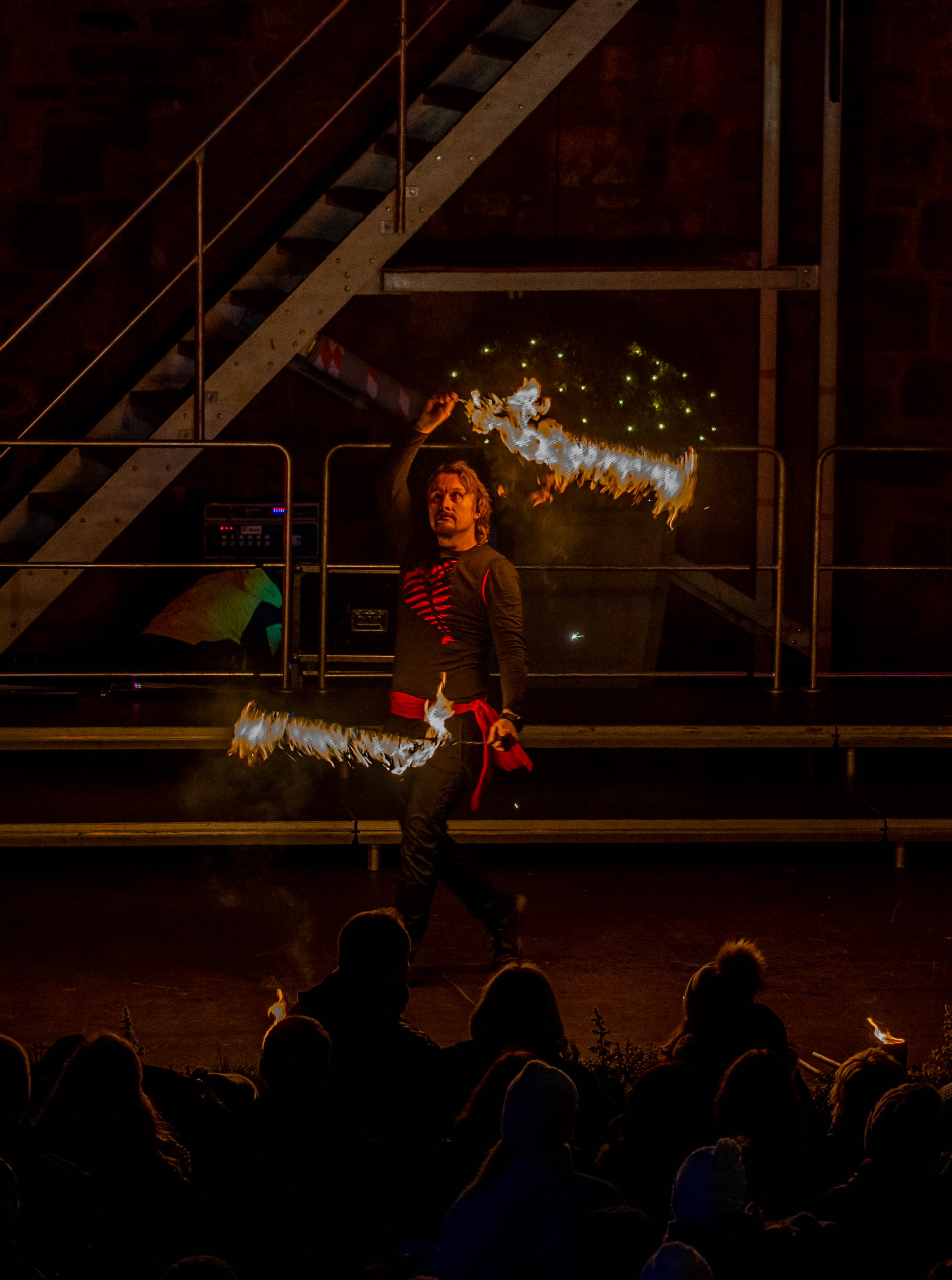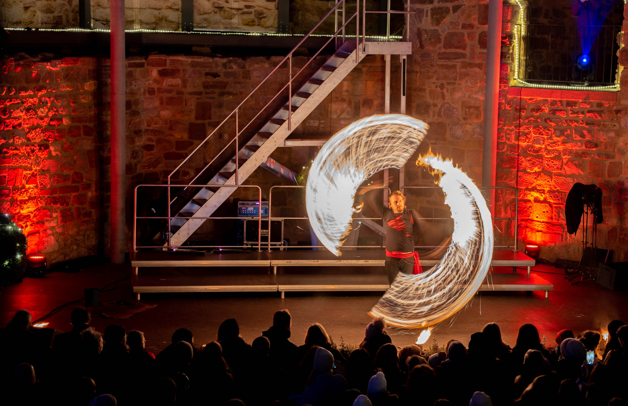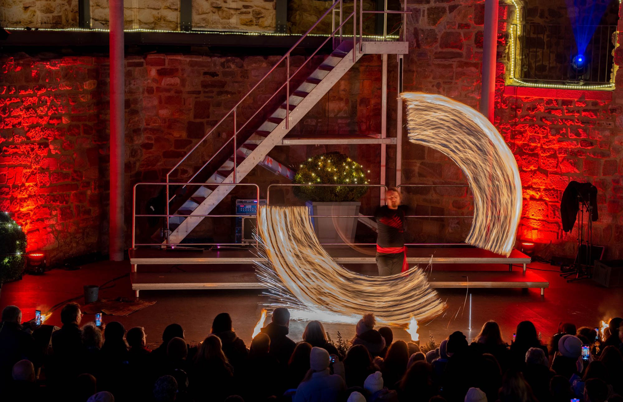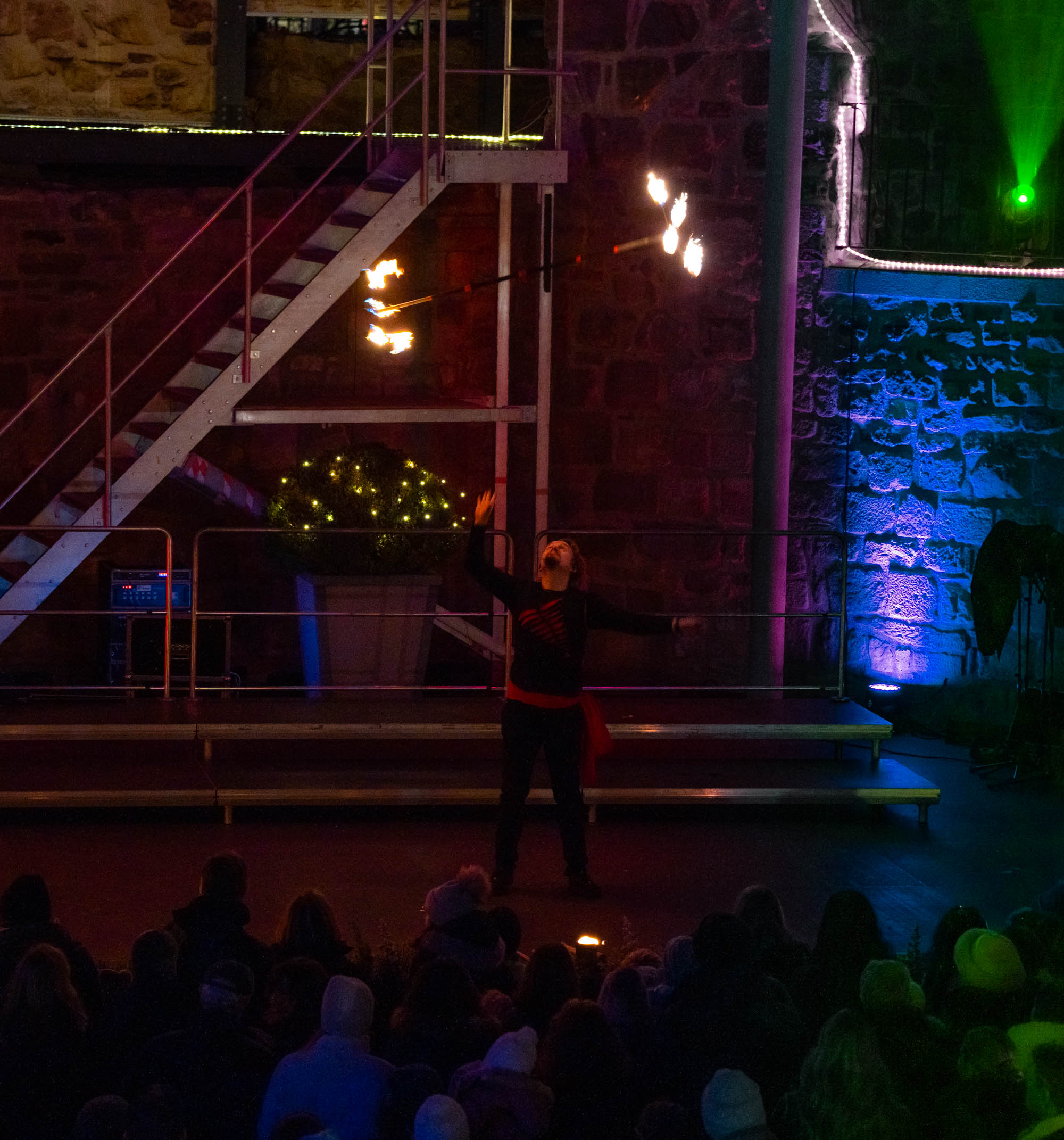 Ich hatte die Freude, den Weihnachtsmarkt in Bad Vilbel auf der historischen Wasserburg mit meiner Classic Fire Show zu bereichern. Auf der Bühne entstand ein Spiel aus Licht, Flammen und Bewegung. Funken sprühten in die Nacht, während die Jonglage mit brennenden Fackeln die Zuschauer in Staunen versetzte. Die Kombination aus klassischer Feuershow und perfekt abgestimmten Flammeneffekten schuf eine festliche, emotionale Atmosphäre.