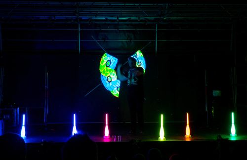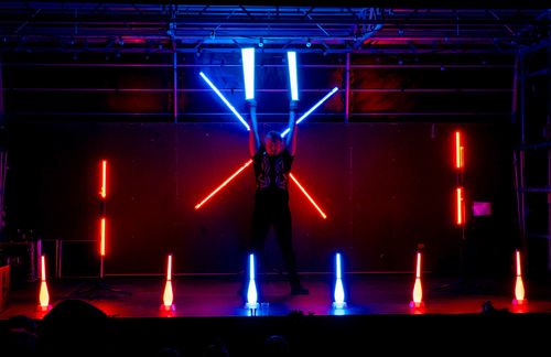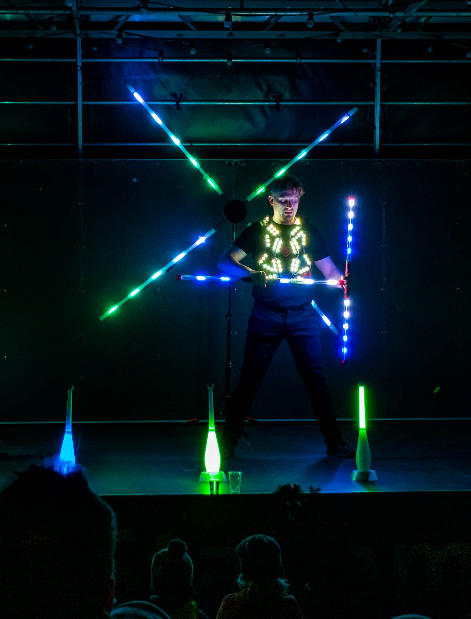 Mit präziser Jonglage und programmierter Lichttechnik erschuf ich Bilder, die sich im Takt der Musik wandelten. Die LED-Requisiten ließen den Platz erstrahlen und verwandelten die Bühne in ein farbenfrohes Schauspiel. Als die Dunkelheit hereinbrach, entfaltete die Show ihre ganze Wirkung – das leuchtende Spektakel fügte sich perfekt in das warme Lichtermeer der Buden ein und zog Besucher aus allen Richtungen an.
