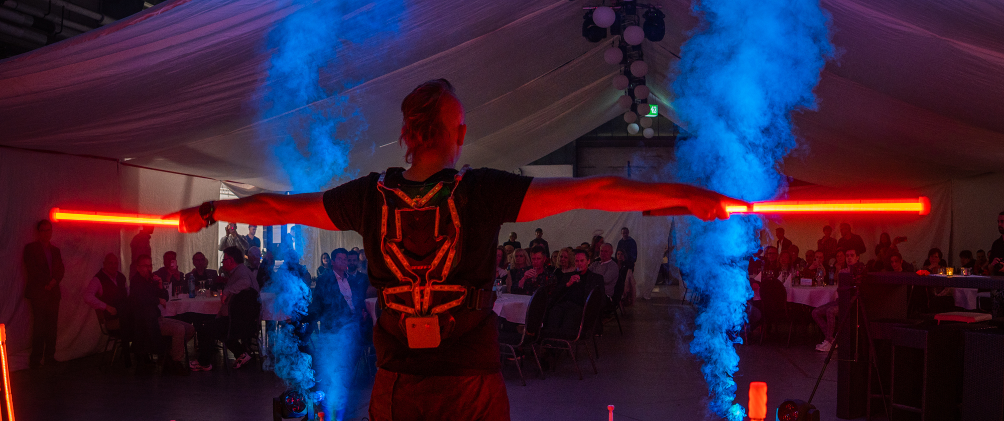 Der Mehrwert für den Veranstalter lag nicht nur in der Unterhaltung der Gäste, sondern in der emotionalen Verbindung von Marke und Erlebnis. Durch die Einbindung des Logos entstand ein Moment der Wiedererkennung, der Stolz und Zugehörigkeit weckte – ein starkes Symbol für Teamgeist und Zusammenhalt. Gleichzeitig war die Show ein reibungslos integrierter Bestandteil des Abends: Absprache mit Brandschutz und Technikdienstleister, Anpassung an die bestehende Bühnen- und Lichttechnik, selbstständige Vorbereitung und Umsetzung – alles verlief professionell und ohne Aufwand für den Kunden.